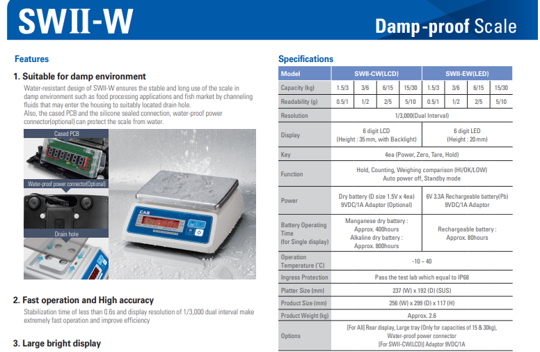 Cân điện tử SWII-EW là dòng cân điện tử chống nước chuyên dùng cho các cửa hàng thực phẩm sạch, các nhà máy sử dụng trong phòng lạnh cần chống nước. Cân điện tử SWII-EW do hãng cân điện tử CAS – Korea sản xuất với các tải trọng khác nhau phù hợp với điều kiện thực tế khách hàng khi cân các sản phẩm.